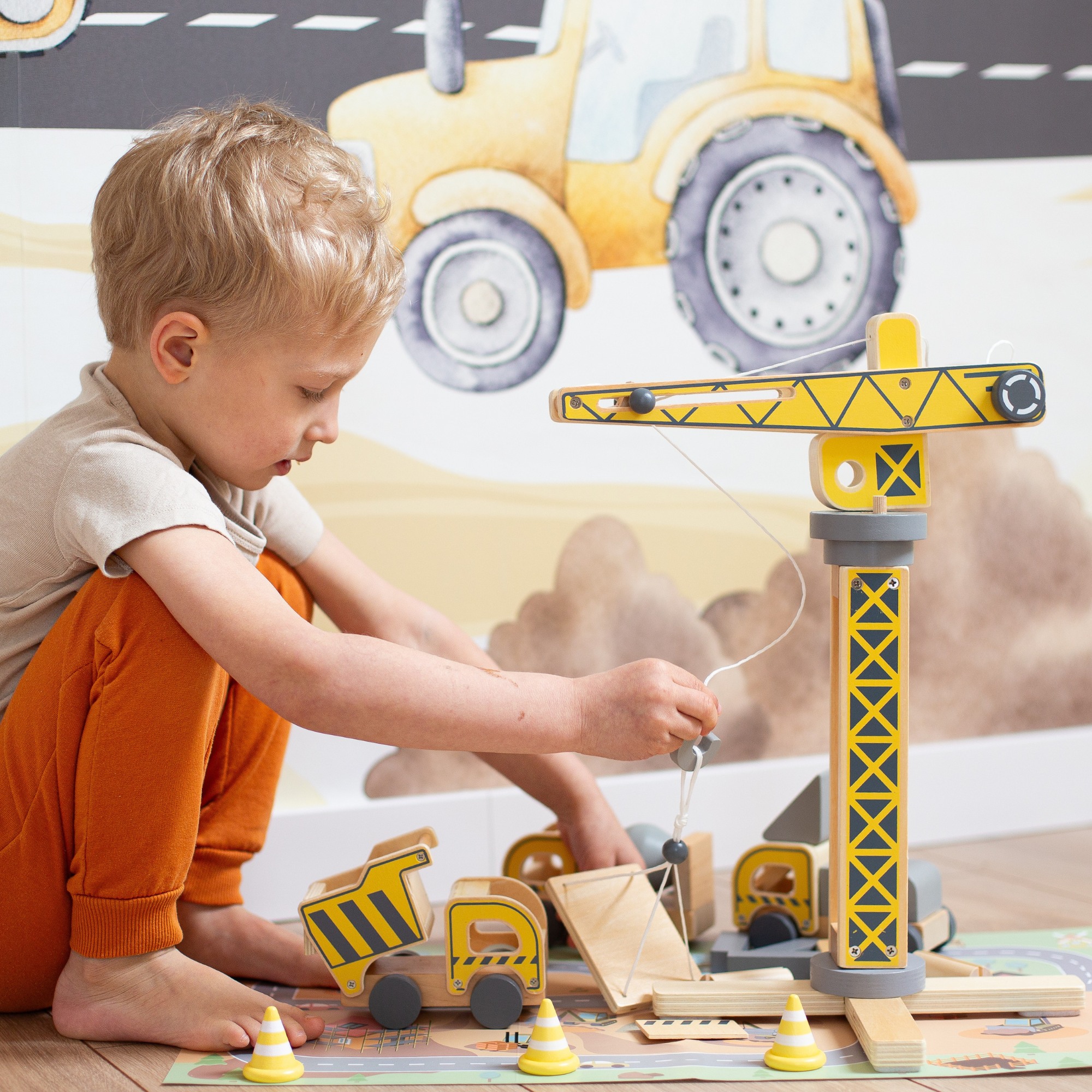 Diventare un costruttore edile è il sogno di molti bambini. Il cantiere in legno con numerosi elementi per il gioco immaginativo li aiuterà a realizzare questo sogno. Il set comprende, tra l'altro, una gru gigante che ruota e solleva i materiali da costruzione su una speciale piattaforma. I veicoli, finemente rifiniti, si muovono su una speciale piattaforma che imita un cantiere. L'intero set è completato da posti di blocco e dissuasori per avvisare i passanti.