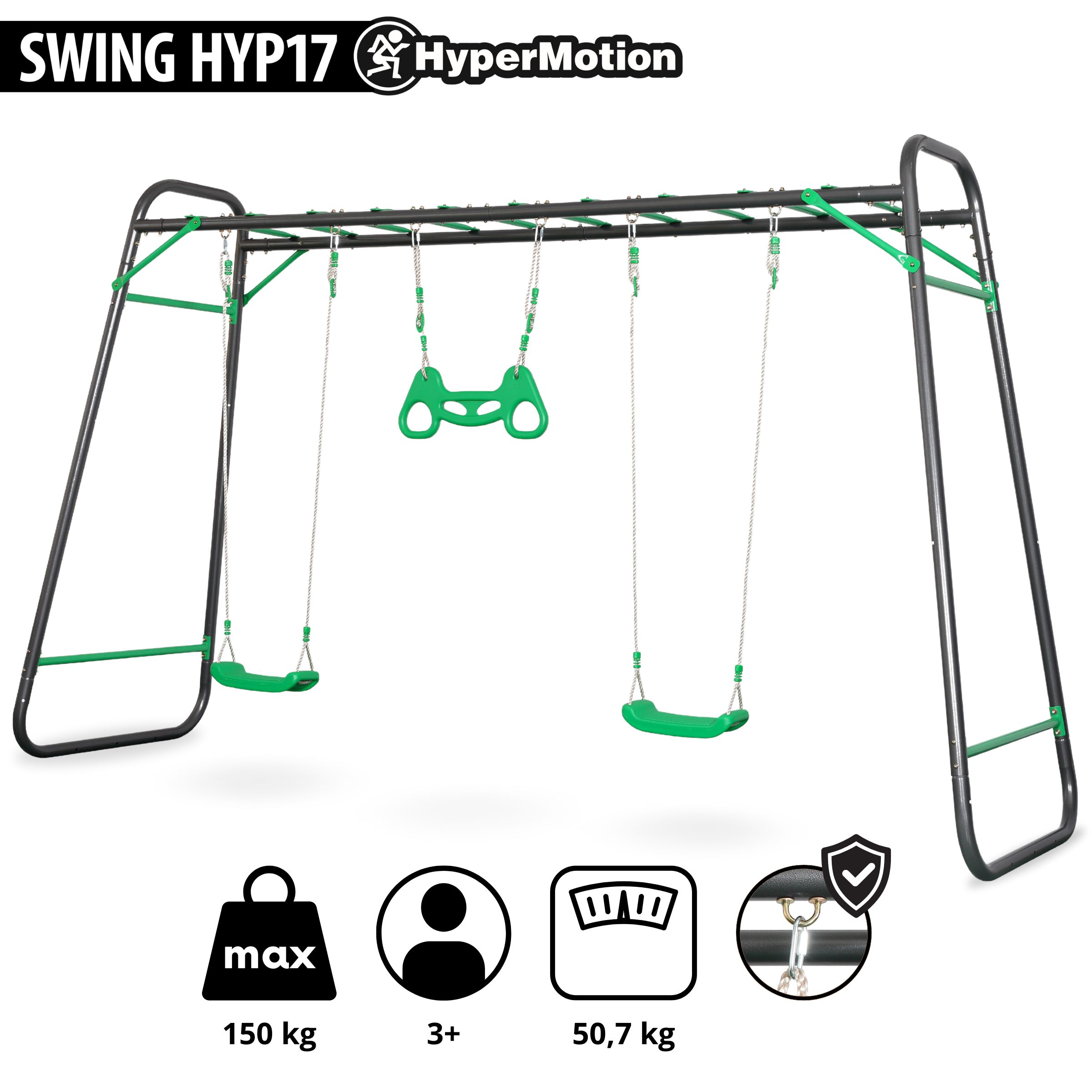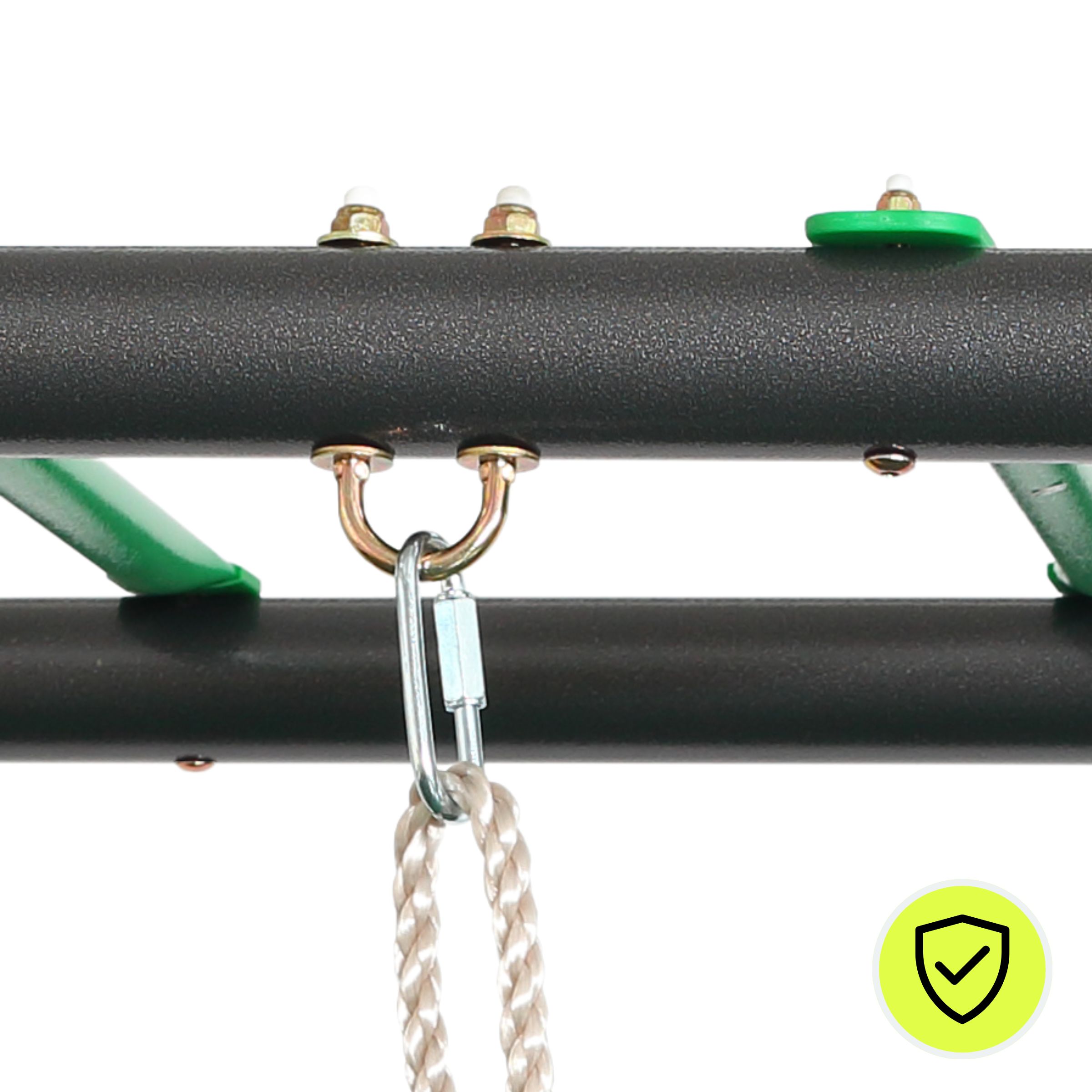 L'altalena su telaio in acciaio con 2 sedili, una scala e un trapezio ginnico soddisfa tutti gli standard di sicurezza richiesti, con una superficie liscia e bordi arrotondati. È stata creata sulla base di elevati standard di qualità, per garantire un uso prolungato e sicuro.
