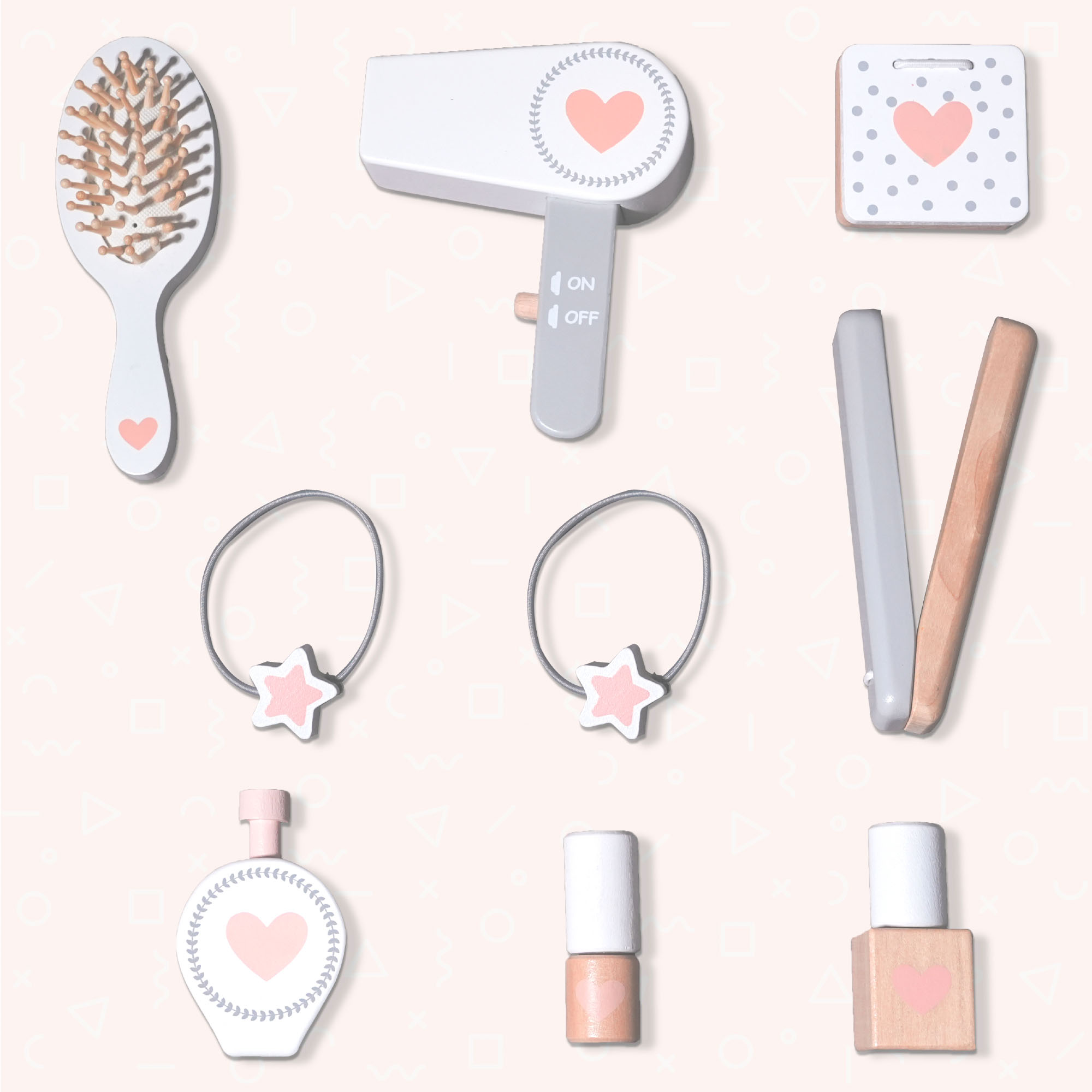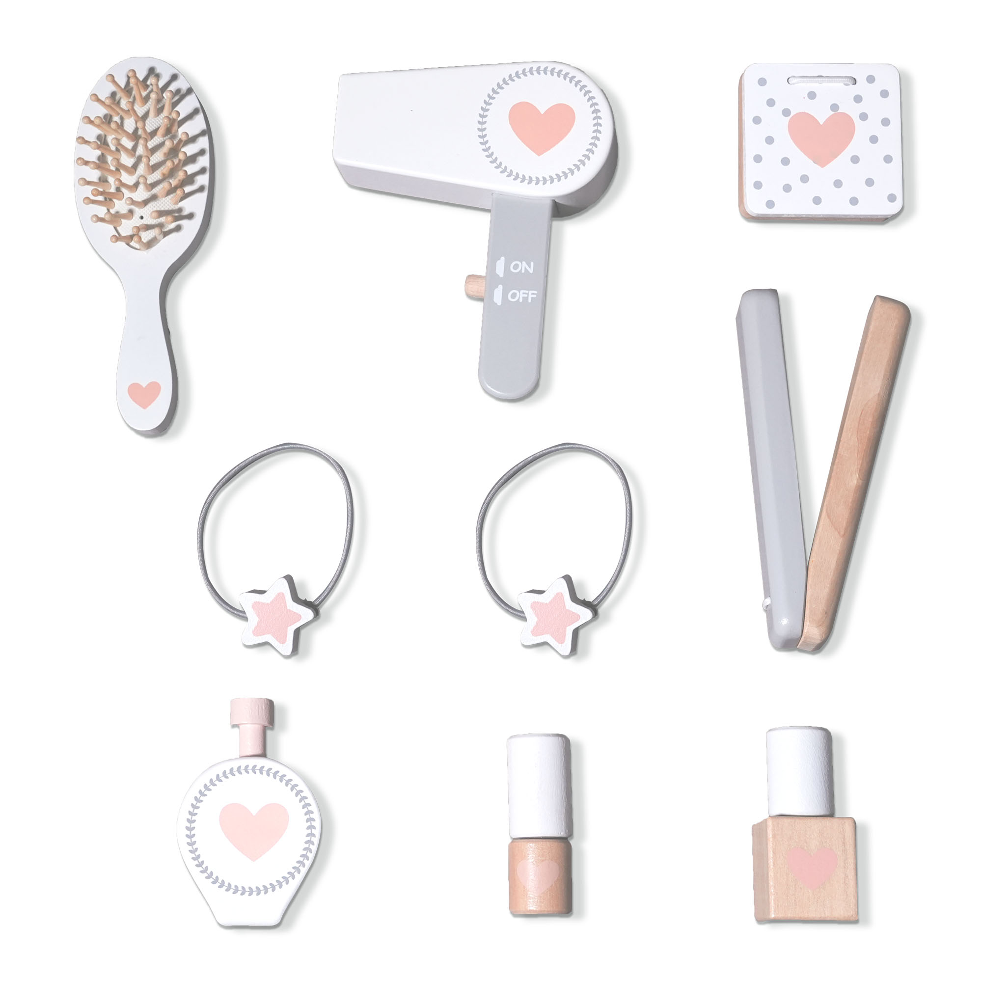 - Fino a 9 accessori inclusi: spazzola per capelli, asciugacapelli, ombretto, 2 elastici, piastra per capelli, profumo, smalto per unghie, rossetto