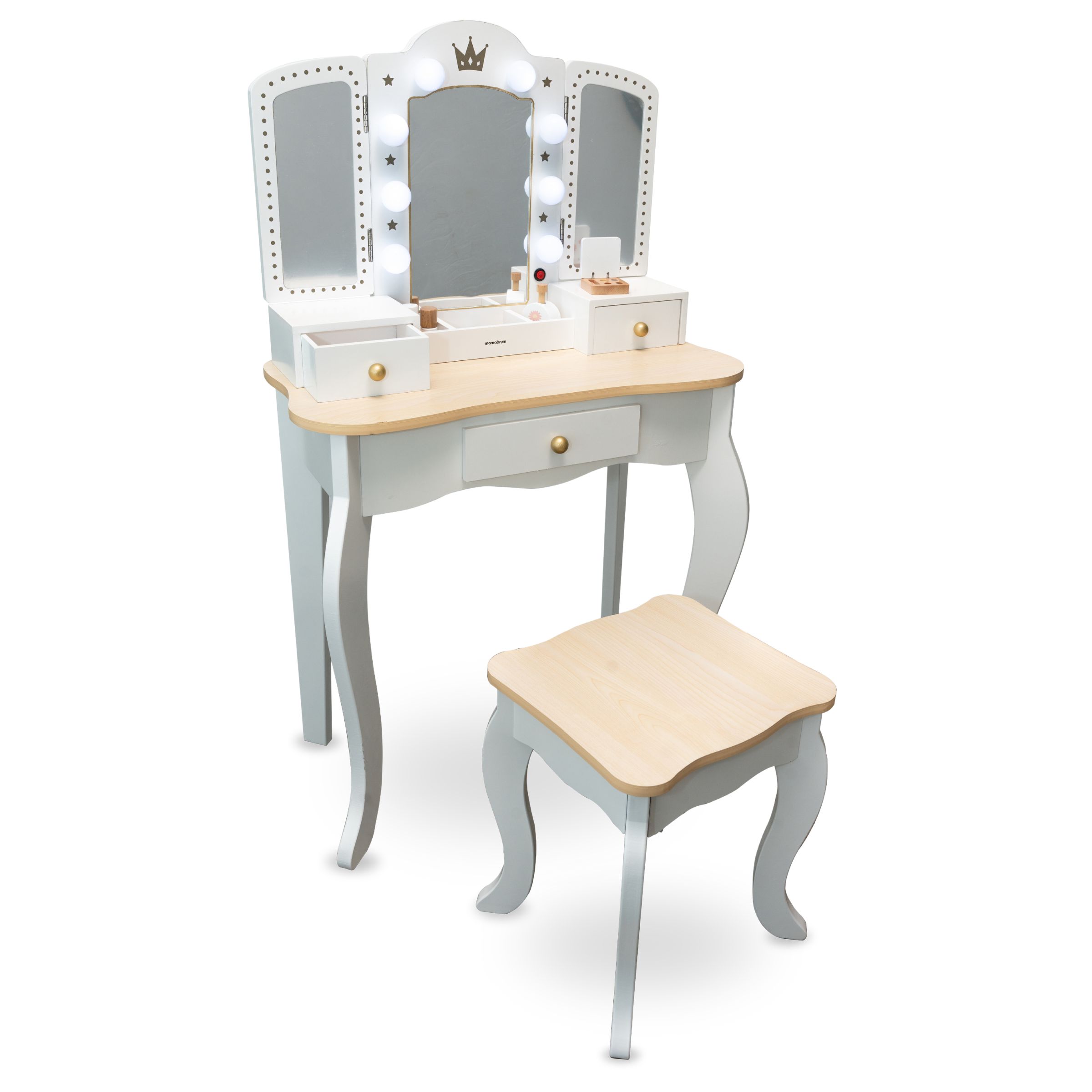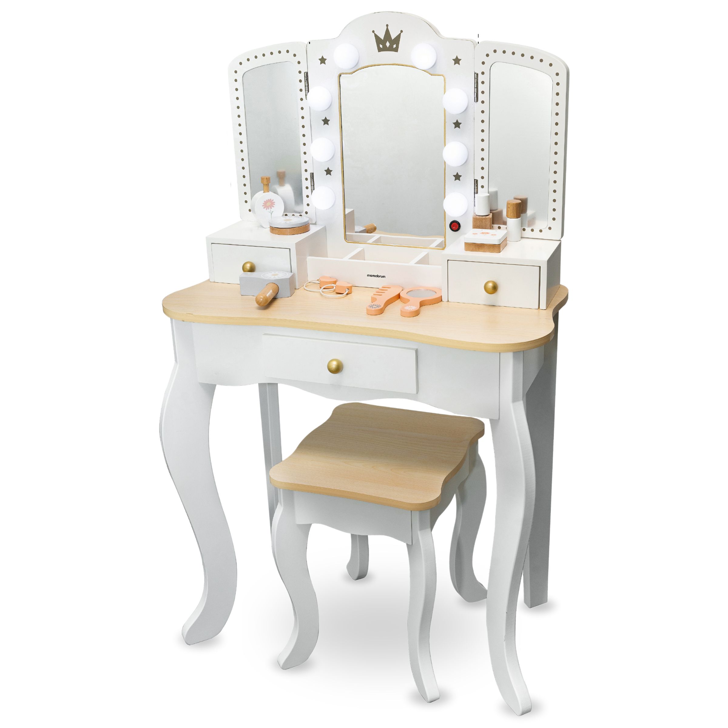 L'illuminazione atmosferica e delicata è garantita da 8 lampadine a LED. Lo specchio può essere rimosso, trasformando la toeletta in una piccola scrivania. Per vedere il viso da un'angolazione diversa, basta regolare gli specchi laterali. La toeletta in legno è un'idea regalo unica per il vostro piccolo!