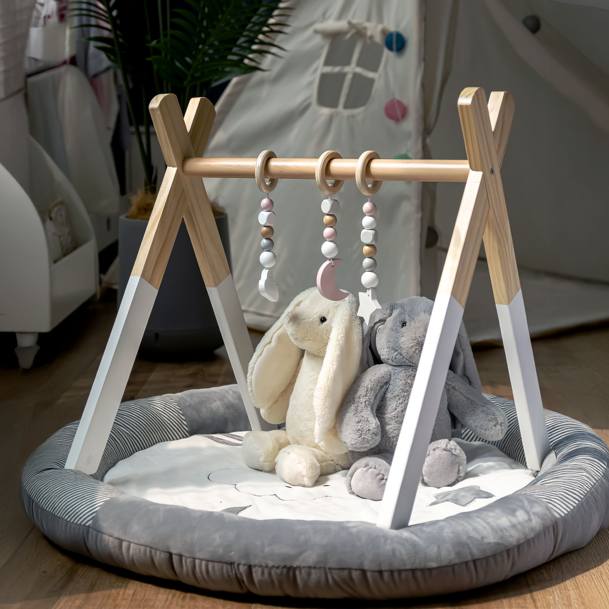 Lo stand educativo in legno Baby Gym è il modo perfetto per rendere le prime attività del vostro piccolo piene di divertimento, movimento e scoperta - supporta lo sviluppo fin dai primi giorni di vita.