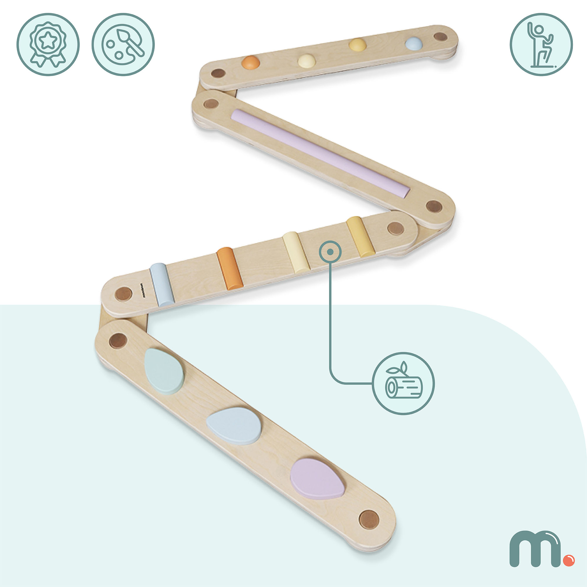 Grazie alle grandi dimensioni delle travi, la pista non è solo stabile, ma anche comoda da usare: il bambino ha abbastanza spazio per fare passi in sicurezza, esercitare l'equilibrio e sviluppare la fiducia. Al termine del gioco, gli elementi possono essere facilmente smontati e riposti in una forma compatta.