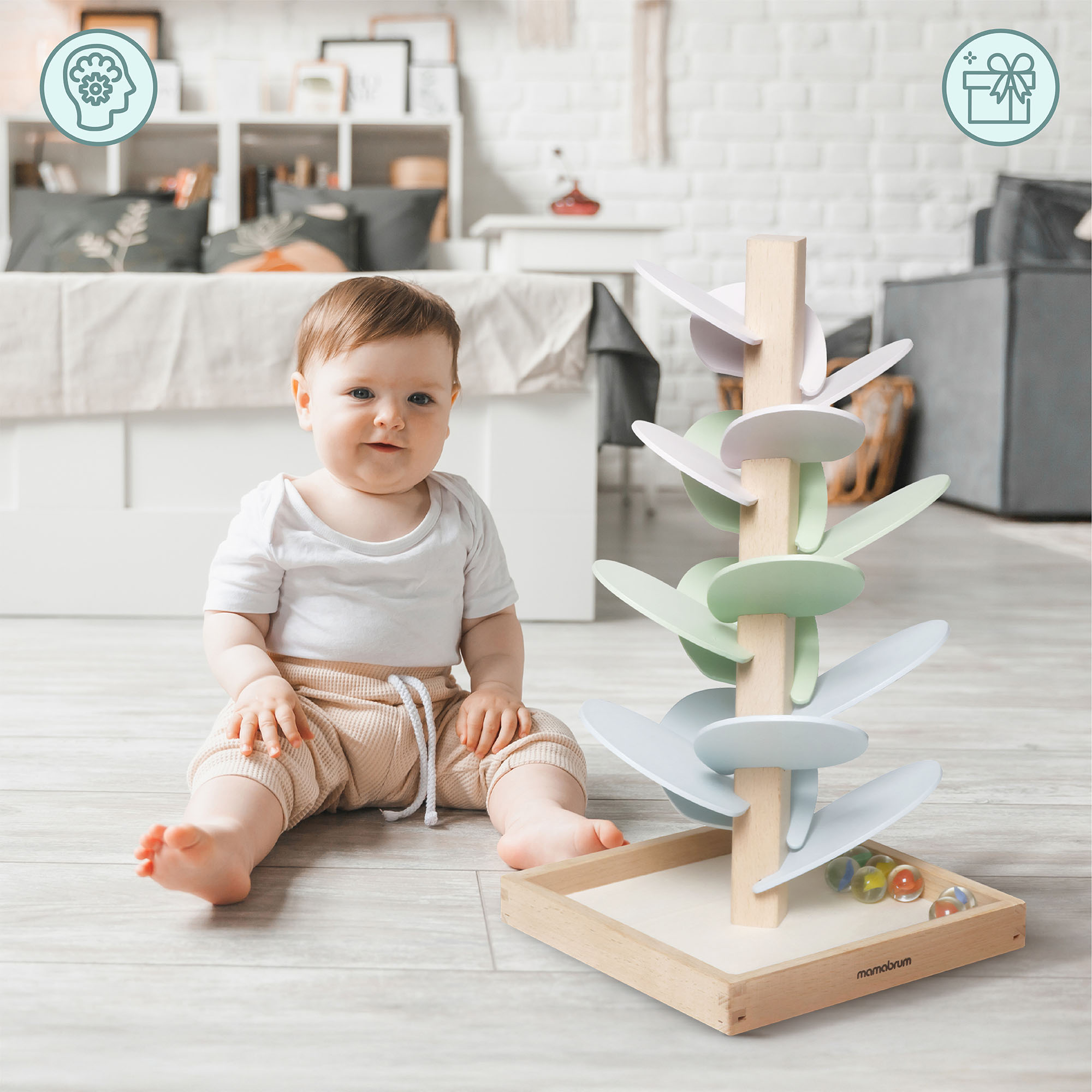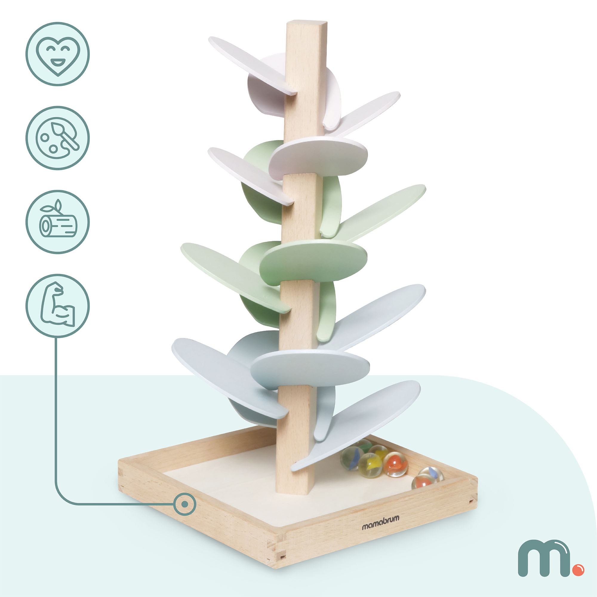 Questo straordinario giocattolo porta il vostro piccolo in un mondo di colori e suoni! È sufficiente posizionare la pallina in cima all'albero e vederla rotolare giù, foglia dopo foglia, emettendo suoni ritmici e incantevoli. Non è solo una fonte di divertimento, ma anche un ottimo allenamento per le manine, i sensi e l'immaginazione del bambino. Questa combinazione favorisce lo sviluppo in modo naturale e coinvolgente.