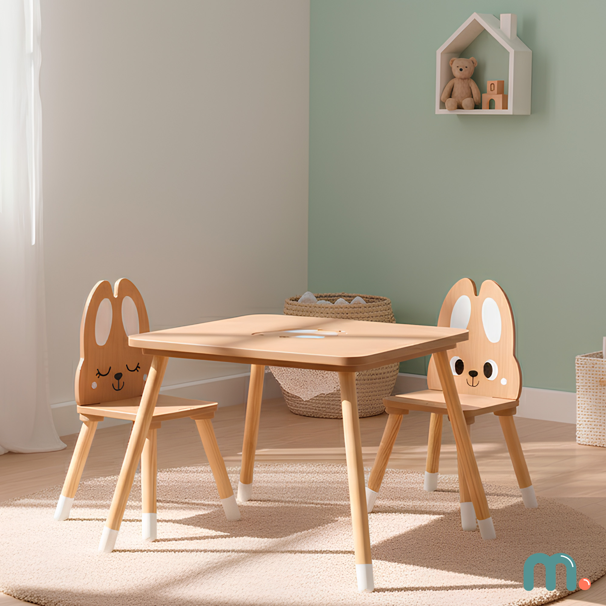 Tavolo in legno con contenitore e 2 sedie Set per bambini - Coniglio carino