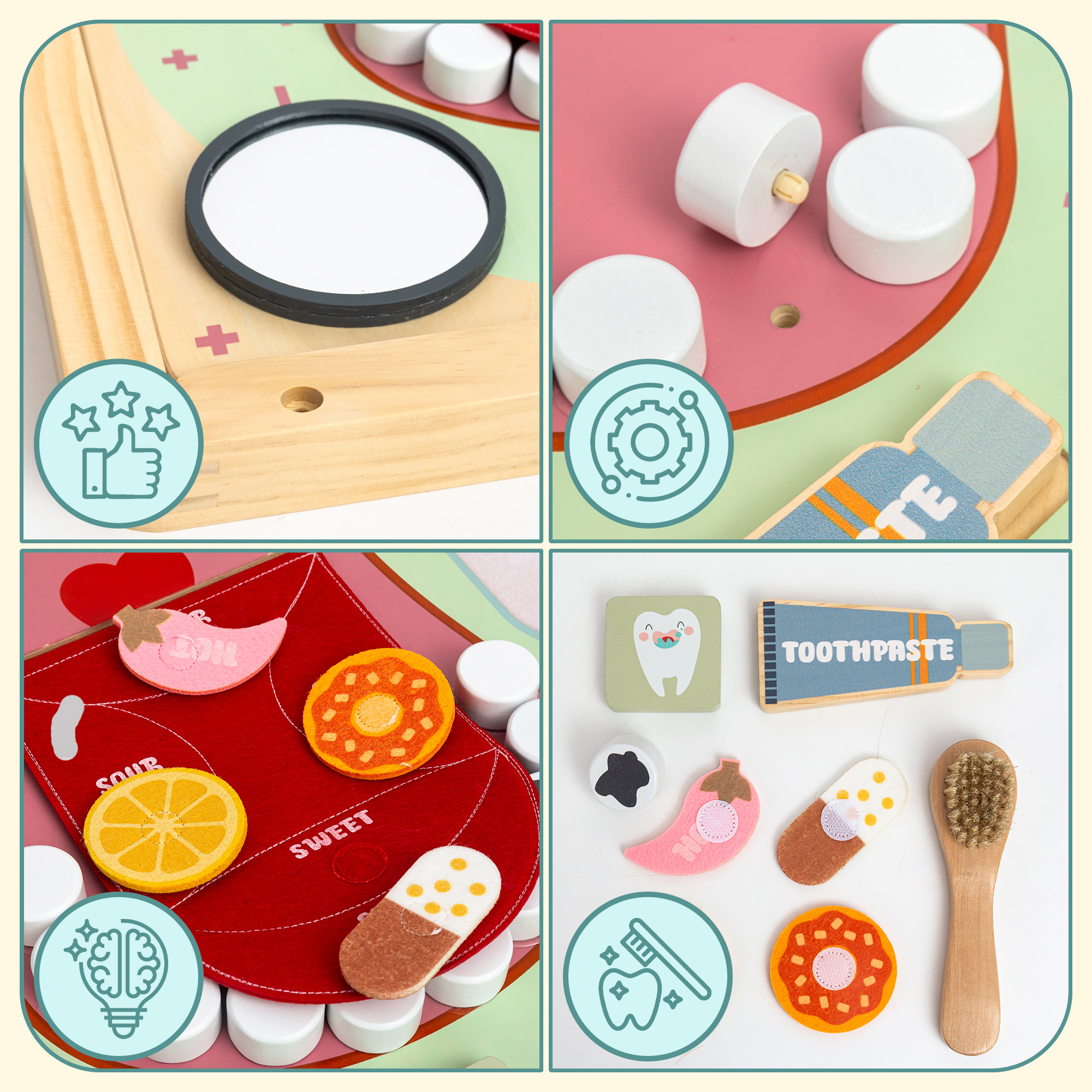 Tavola didattica Montessori in legno Piccolo Dentista - spazzolino da denti, dentifricio, denti rimovibili, specchio, cibo, apprendimento dei sapori