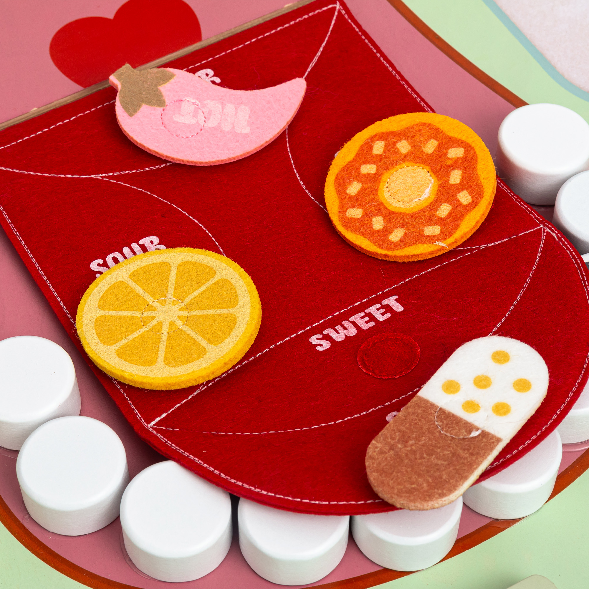 Il dente rimovibile è la più grande attrazione della tavoletta! Il tuo piccolo può rimuoverlo e "curarlo" da solo, per poi reinserirlo. È un'ottima opportunità per la sua prima esperienza dal dentista: spazzolare i denti, applicare il dentifricio e prendersi cura del sorriso sano del suo "paziente". Una grande tavoletta con i nomi dei gusti a forma di lingua offre ulteriore divertimento, dimostrando come le diverse parti della bocca siano responsabili del riconoscimento dei sapori.