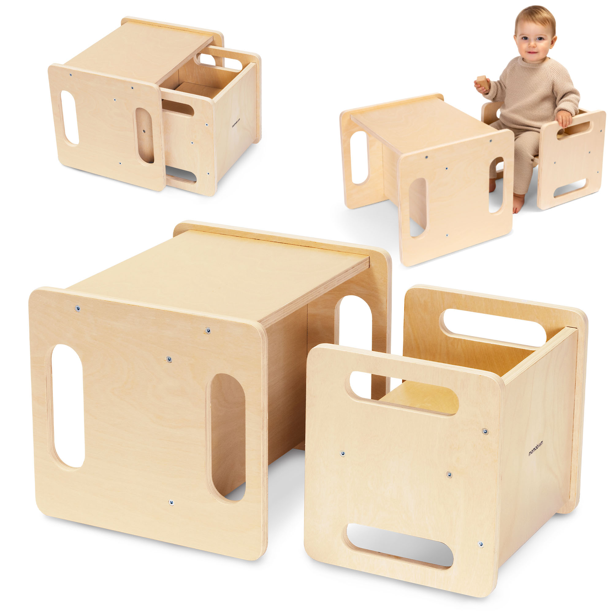 Tavolo e sedia in legno con funzione di piattaforma: un set Montessori multifunzionale per bambini