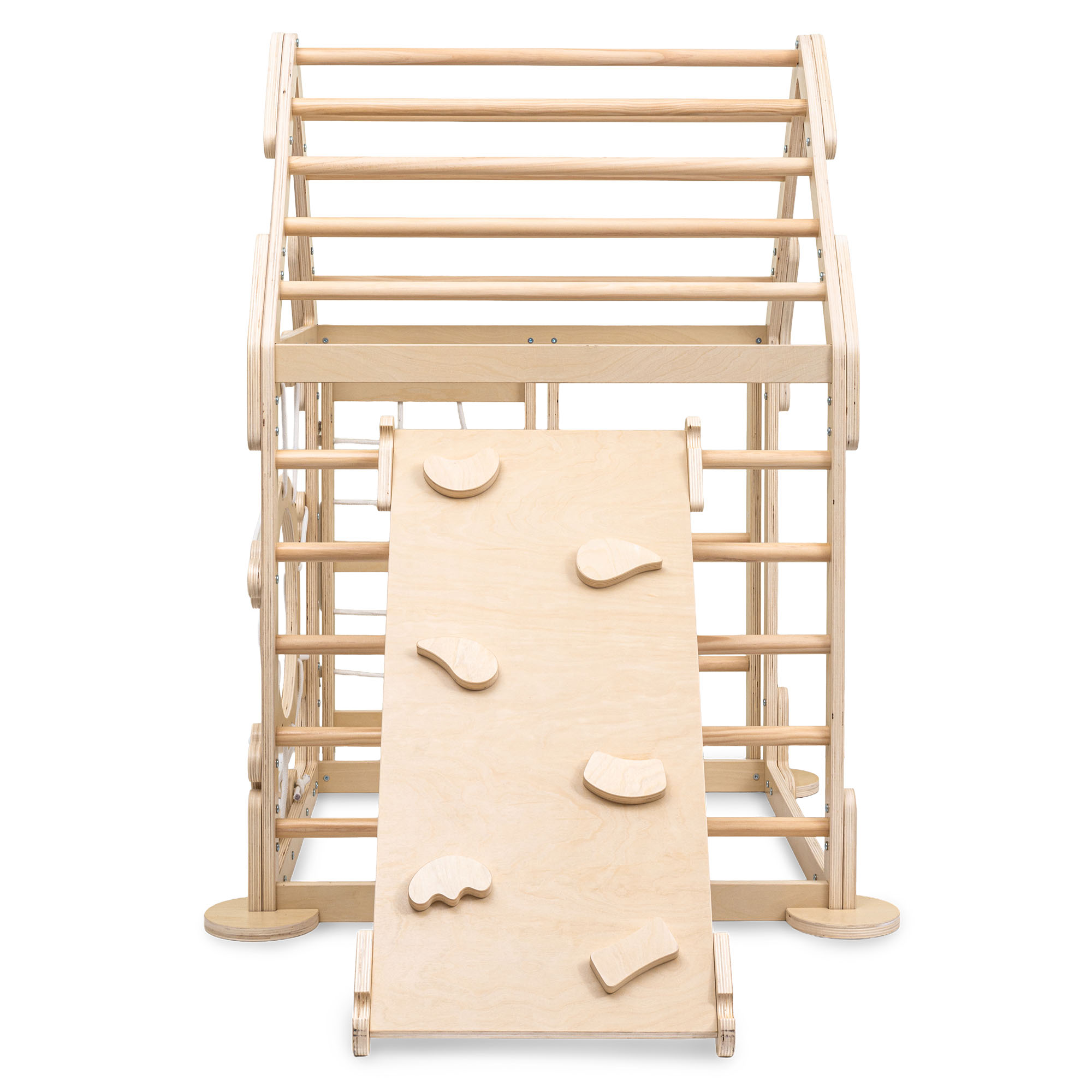Regala al tuo bambino un vero parco giochi... proprio nella sua cameretta! La casa da arrampicata in legno Mamabrum combina una scala ginnica, una parete da arrampicata, una rete, un'apertura circolare per l'arrampicata e un tetto per l'arrampicata. La sua versatilità la rende un centro attività che incoraggia il movimento, sviluppa la forma fisica e offre ore di divertimento.