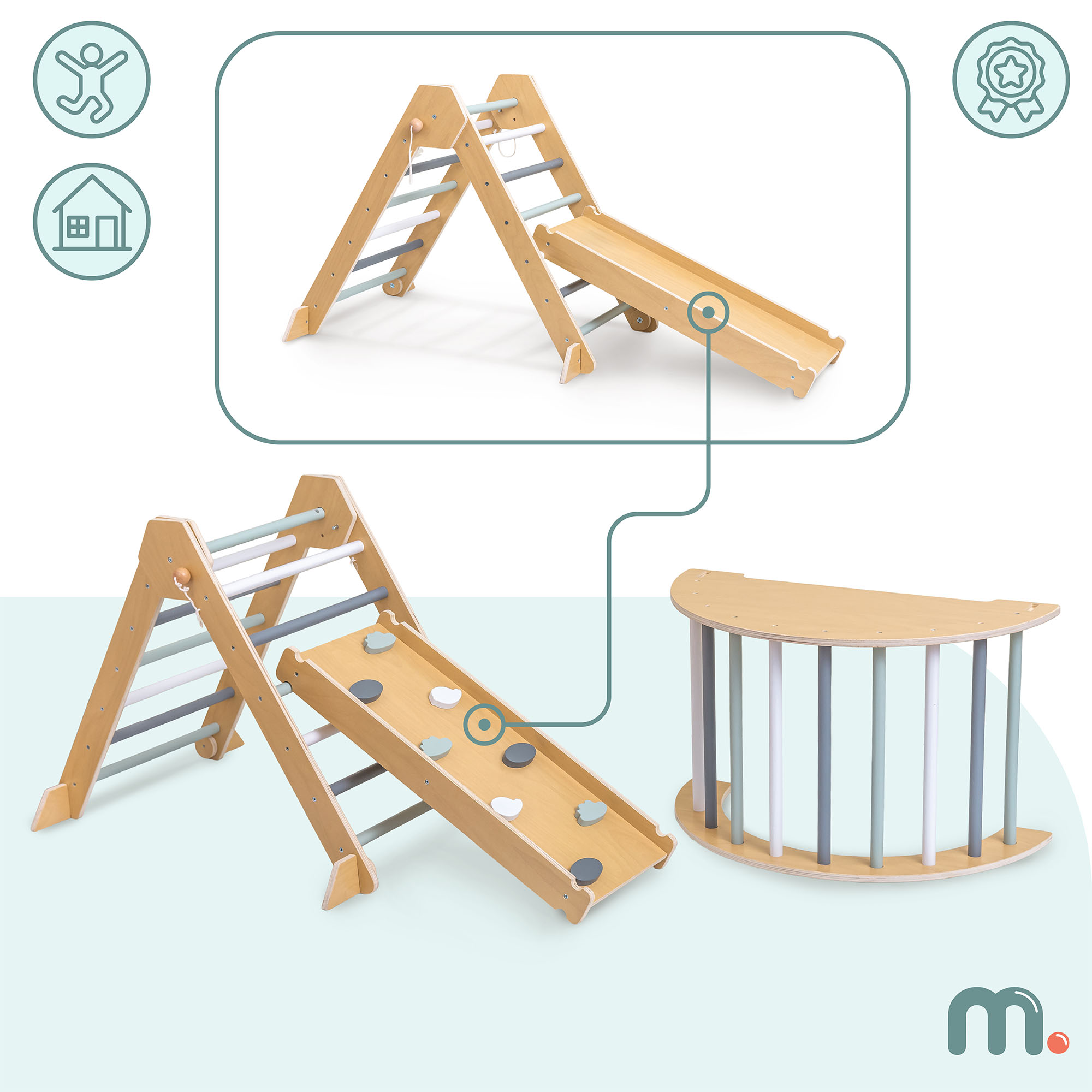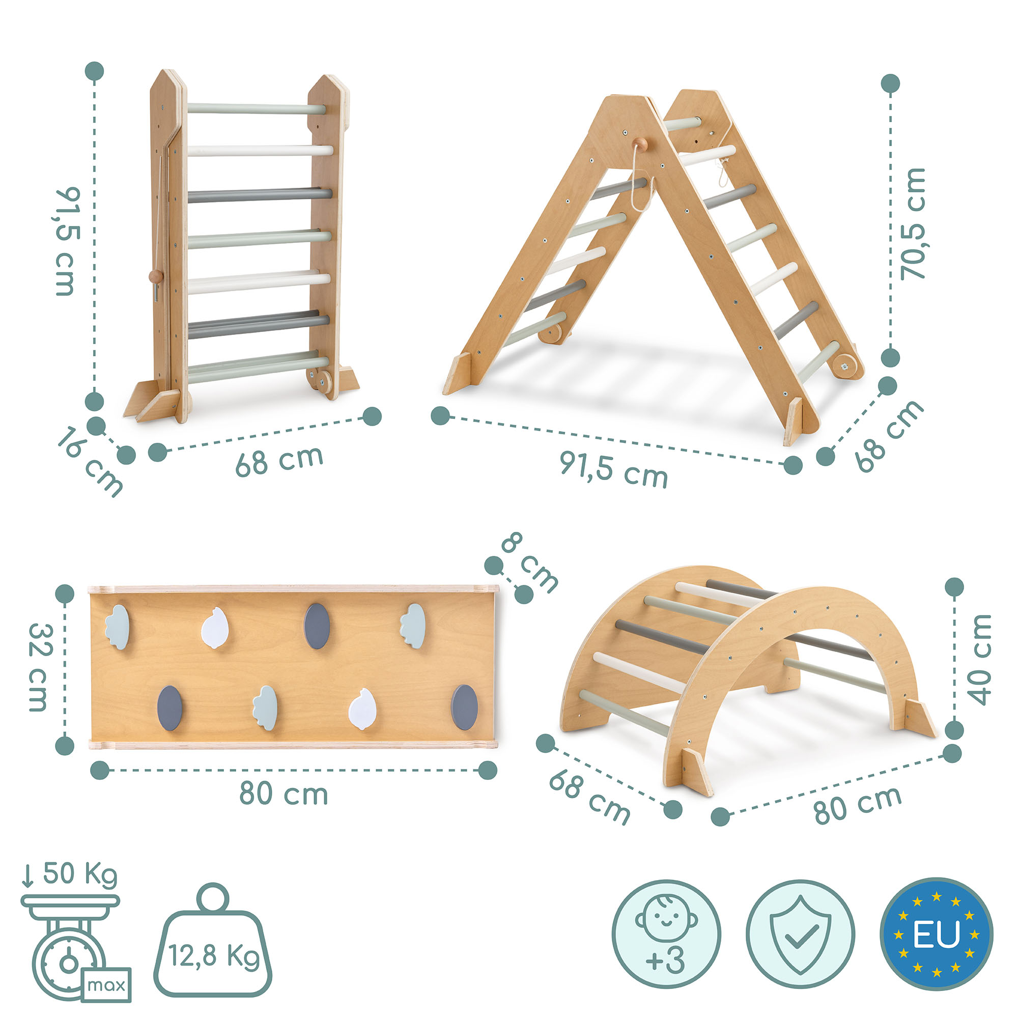 Questo parco giochi in legno è la soluzione perfetta per i genitori che desiderano offrire ai propri figli una dose giornaliera di esercizio e divertimento senza uscire di casa . Il parco giochi è composto da un triangolo Pikler, un arco/dondolo da arrampicata e una rampa bifacciale, che possono essere combinati in varie configurazioni . Questo stimola l'arrampicata, l'equilibrio, lo scivolamento e la costruzione di percorsi a ostacoli. Questo set supporta lo sviluppo delle capacità motorie grossolane, della coordinazione e dell'autostima nei bambini.