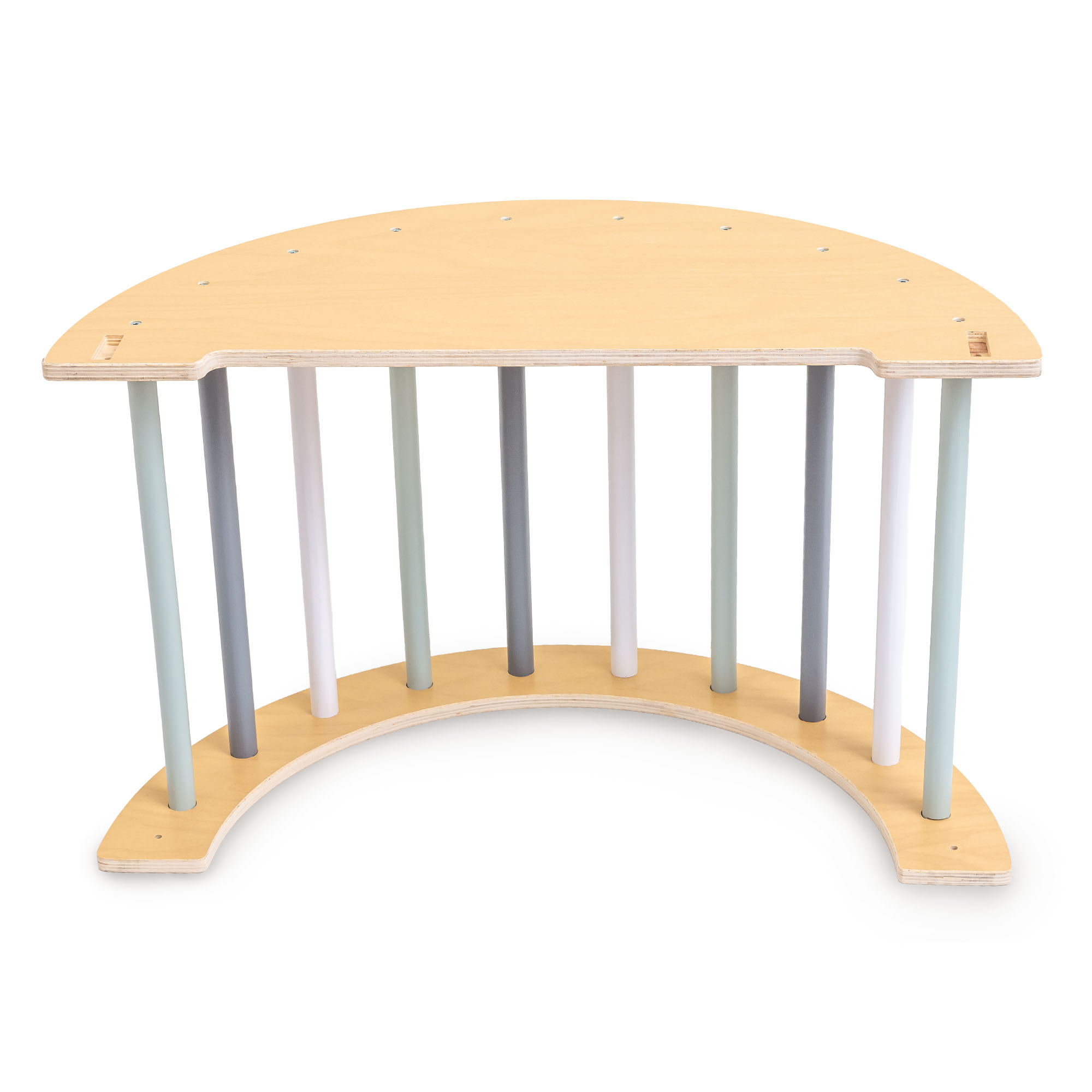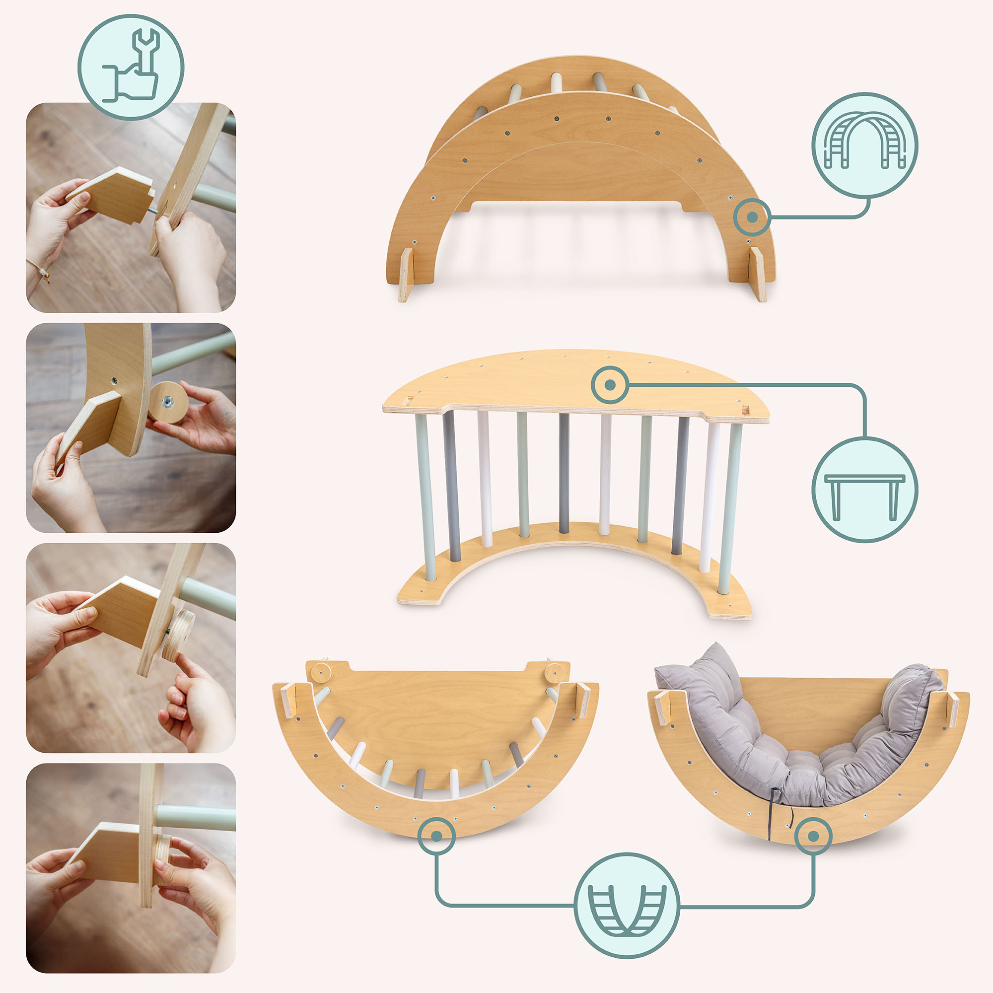 L'arco incoraggia l'arrampicata, l'equilibrio e il superamento di percorsi a ostacoli . Basta capovolgere l'arco e posizionare un cuscino o una coperta al suo interno per creare una sedia a dondolo sicura, perfetta per un gioco tranquillo e rilassante. L'arco può anche essere utilizzato come tavolo , perfetto per disegnare, giocare con i mattoncini o leggere libri.