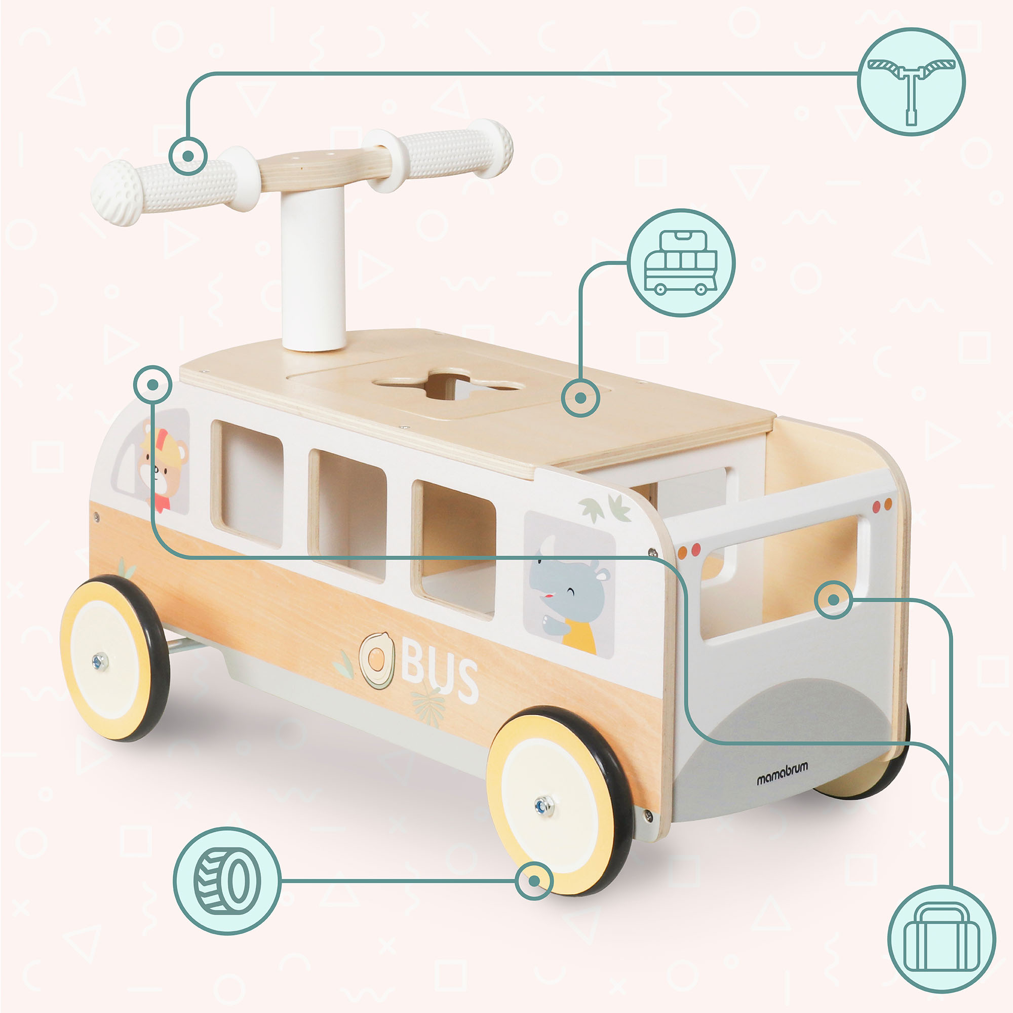 Il cavalcabile Mamabrum è un vero e proprio centro di gioco attivo ed educativo . Promuove l'equilibrio, la coordinazione e l'indipendenza, incoraggiando al contempo la creatività. I ​​più piccoli possono trasportare i loro giocattoli preferiti, riporre piccoli oggetti e organizzare i propri mini-viaggi .