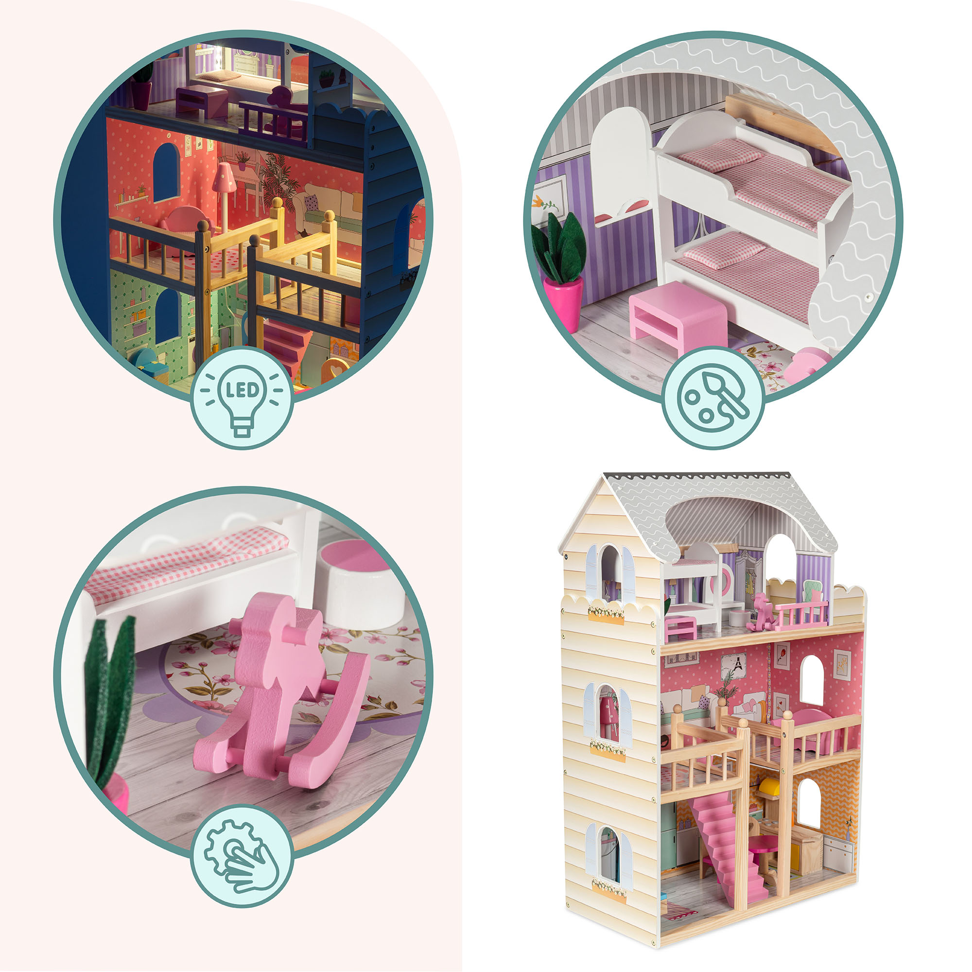 Grande casa delle bambole in legno a 3 piani con terrazza, set di mobili e illuminazione a LED!