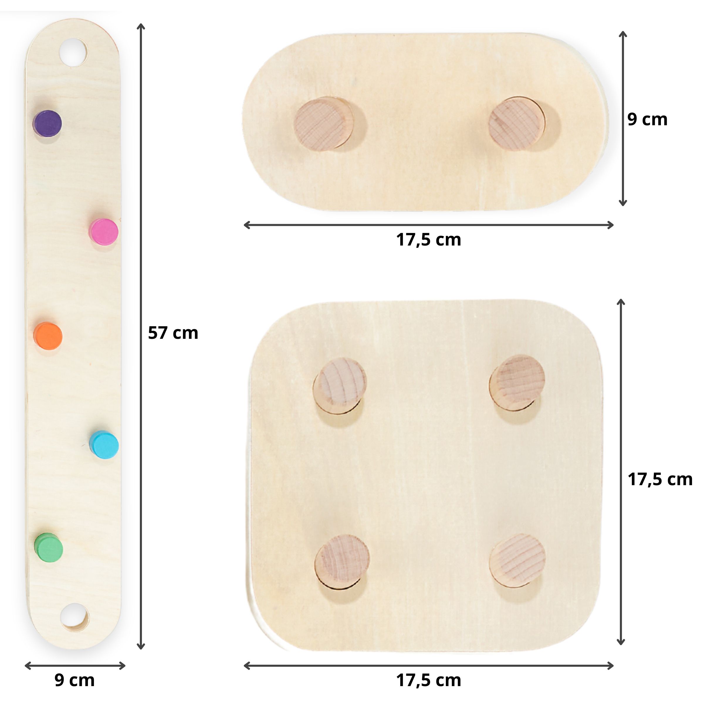 • 7 lunghe travi contengono pezzi colorati dalle forme interessanti e accattivanti