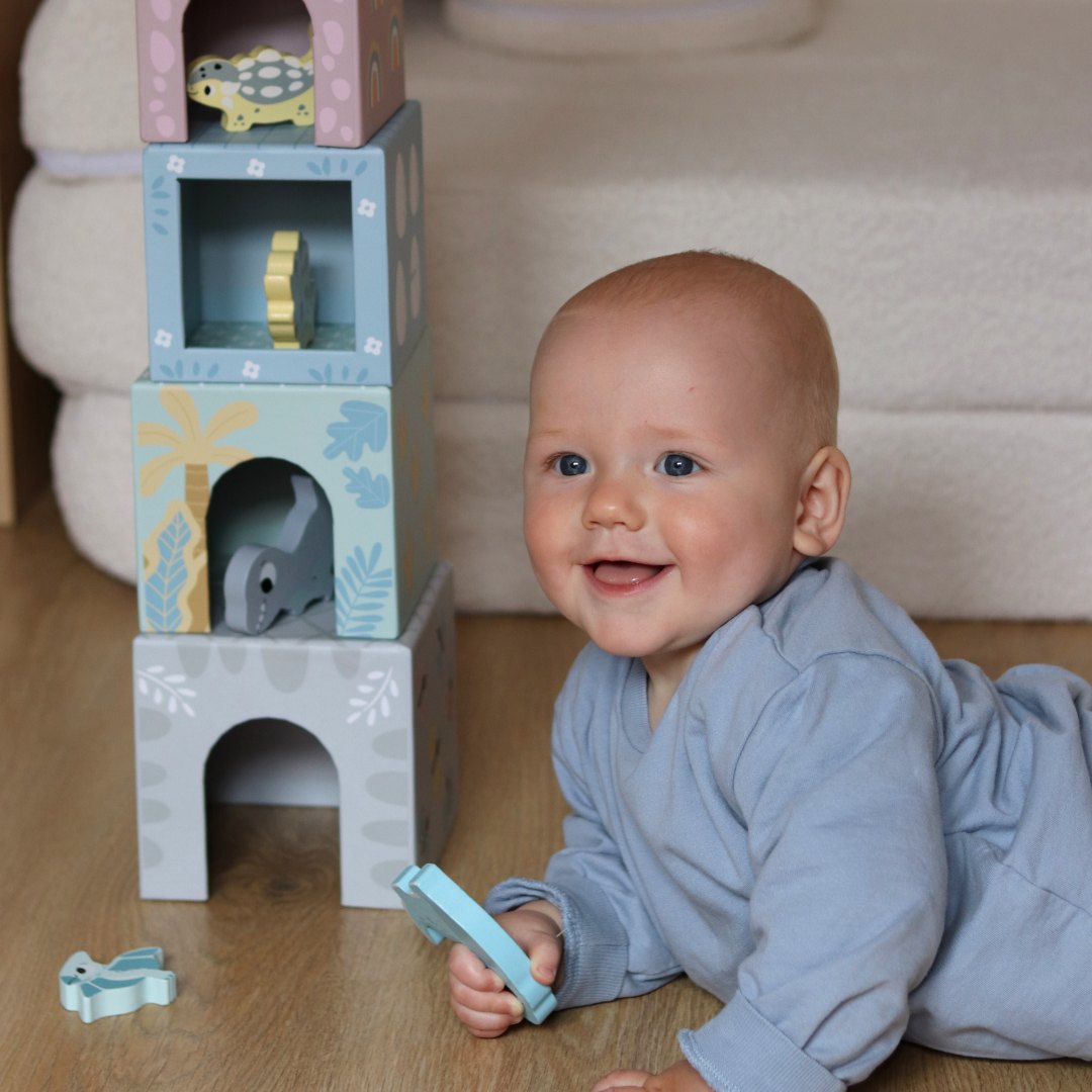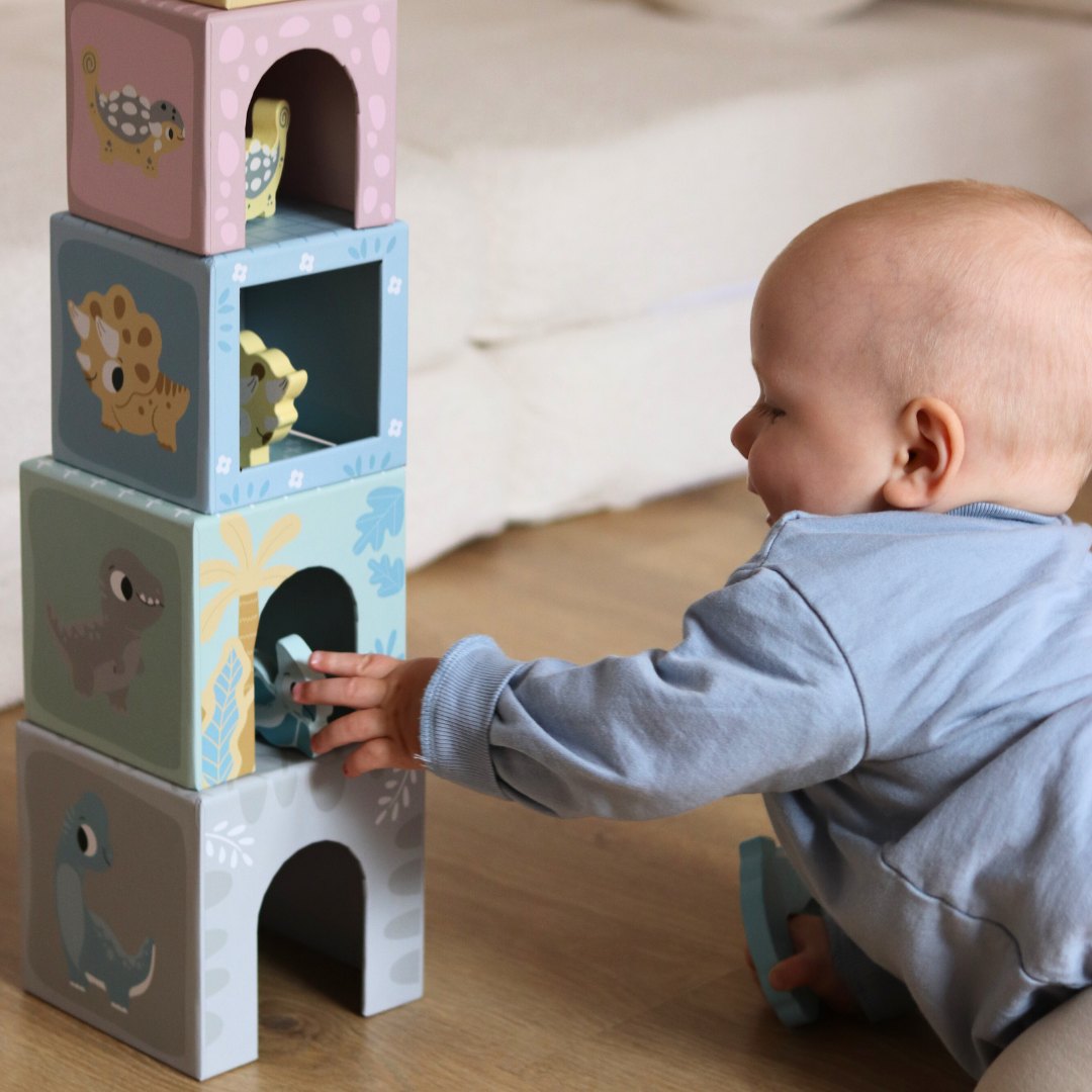Questo giocattolo è sicuramente in grado di fornire al vostro piccolo un sacco di divertimento! Tutto quello che dovete fare è costruire una piramide di scatole di cartone e poi mettere il dinosauro corrispondente in ogni scatola. La stampa colorata sulle scatole serve da indizio per il bambino. Il bambino può non solo costruire le torri, ma anche utilizzare il giocattolo in molti modi diversi, sviluppando così la sua creatività.