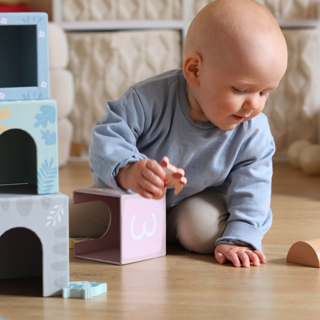 Impilando le scatole di cartone una sull'altra, i bambini sviluppano la coordinazione occhio-mano ed esercitano la manualità. Posizionare i dinosauri nelle scatole giuste migliora la precisione e la concentrazione. I primi successi rafforzano la fiducia dei bambini in se stessi, regalando loro tanto divertimento. Il giocattolo insegna anche la percezione. Può essere utilizzato per supportare l'apprendimento dei colori e dei numeri. Ha un carattere educativo e la sua molteplicità di usi favorisce lo sviluppo della creatività dei bambini.