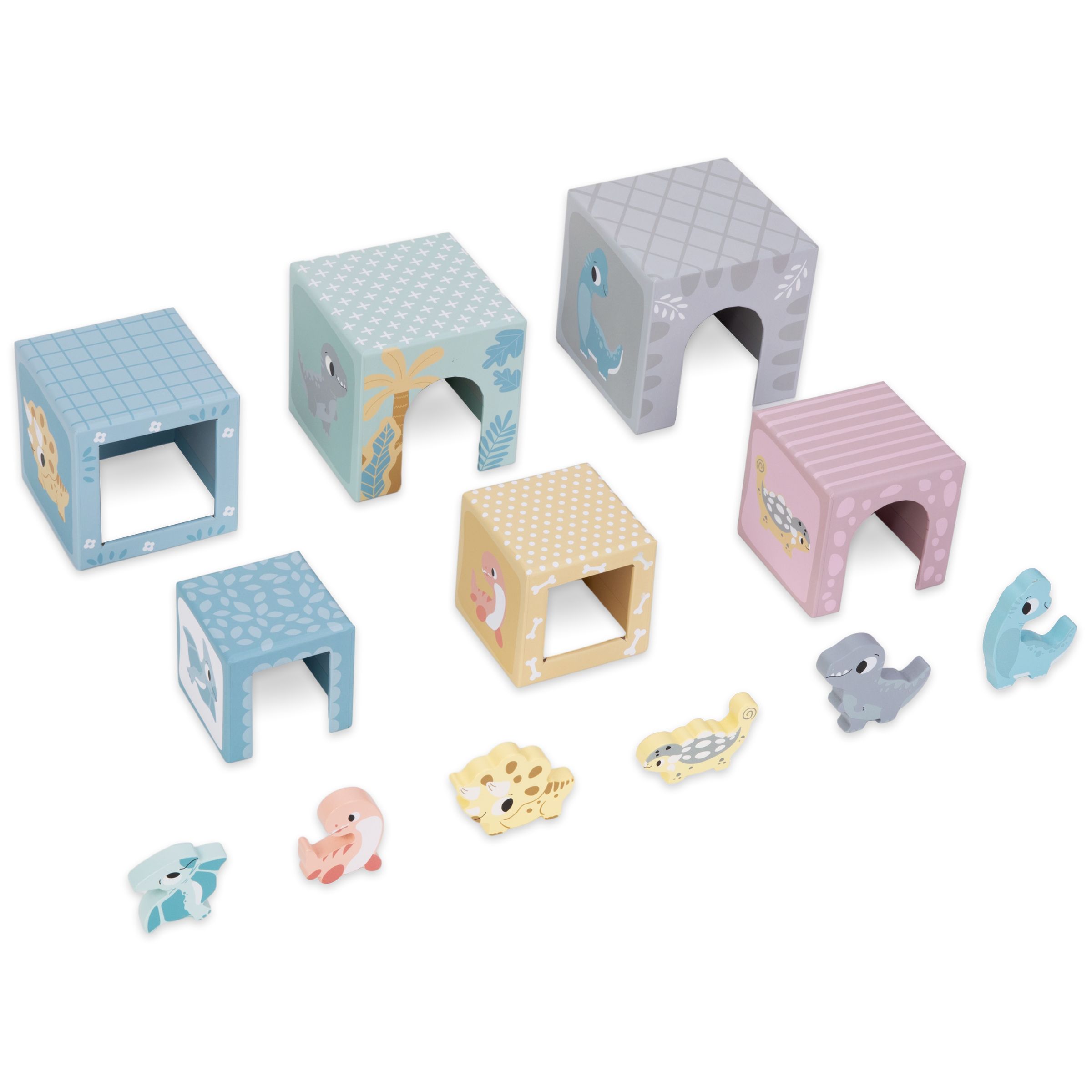 - il set è composto da 6 scatole di cartone di dimensioni diverse, numerate da 1 a 6, e da 6 dinosauri di legno